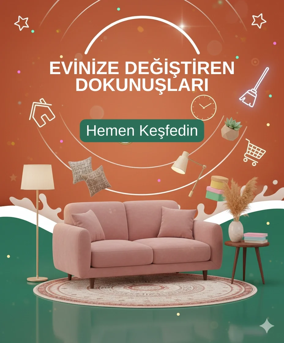 Ev konforunu artırmak isteyen kullanıcılar için nevresim takımları, halılar, organizerler ve modern aksesuarlar sunulur.